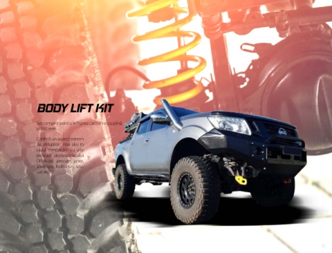 BodY LIFt KIt Set complet pentru înălţarea caroseriei cu până la 100 mm. Conferă un aspect extrem de atrăgător, mai ales în cazul combinării cu alte produse destinate uzului Off-Road, precum jante, anvelope, bullbaruri, scu- turi etc. 41