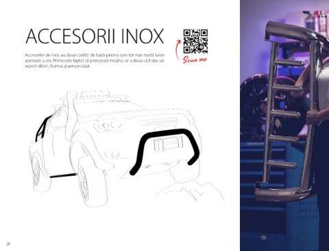 ACCESORII INOX Accesoriile de inox au două calităţi de bază pentru care tot mai multă lume apelează la ele. Prima este faptul că protejează mașina, iar a doua că îi dau un aspect diferit, frumos și personalizat. 28