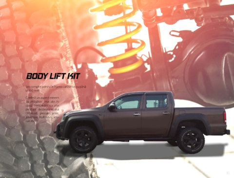 BOdY LIFt KIt Set complet pentru înălţarea caroseriei cu până la 100 mm. Conferă un aspect extrem de atrăgător, mai ales în cazul combinării cu alte produse destinate uzului Off-Road, precum jante, anvelope, bullbaruri, scu- turi etc. 41