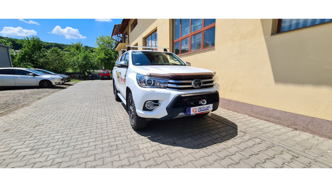 On June 9, 2021, a Toyota Hilux, model year 2017, was equipped with a canopy, winch, winch plate, and hood guard. The solution was chosen for off-road readiness and protection.