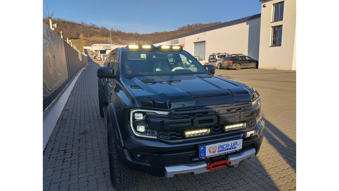 On March 5, 2025, a Ford Ranger Raptor, model year 2024, was fully equipped with a hardtop, window visors, hood guard, spot lights, winch, and winch plate for complete off-road readiness.