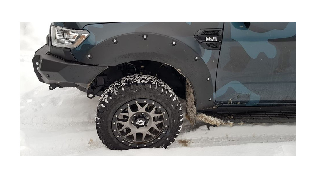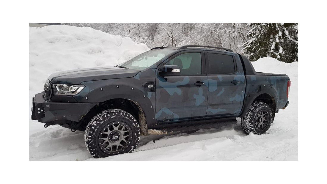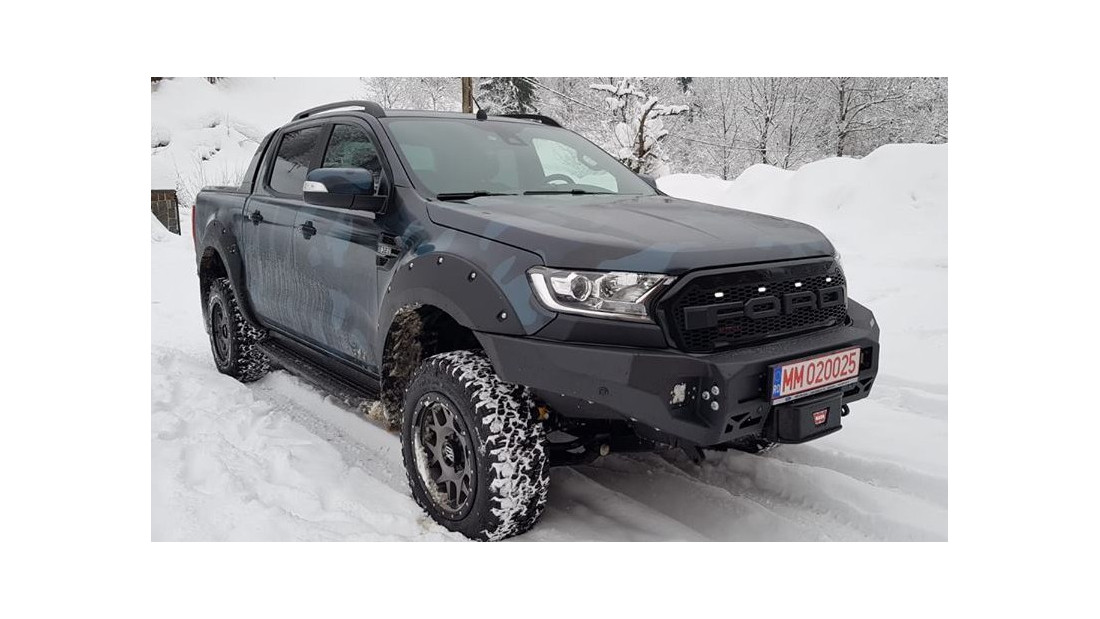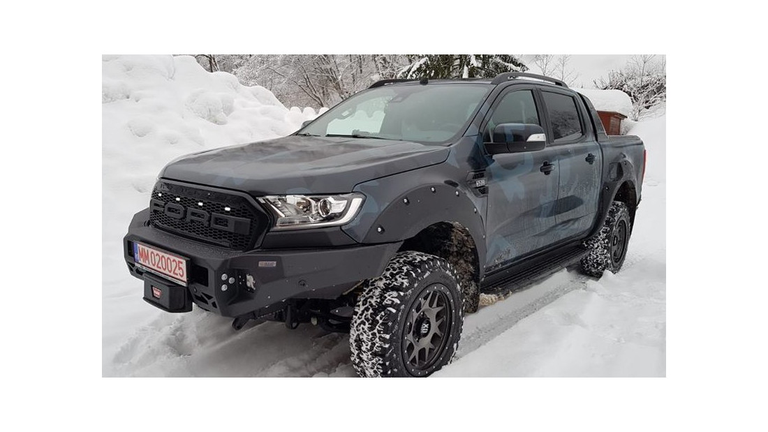 In January 2019, a Ford Ranger, model year 2017, was equipped with overfenders, RIV bullbar, winch, and a Raptor-style grille. The solution was chosen for rugged styling and off-road readiness.