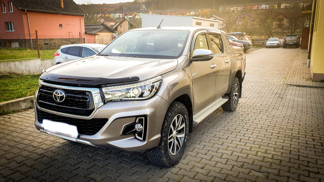 On November 14, 2019, a Toyota Hilux, model year 2019, was equipped with a tonneau cover, window visors, and hood guard. The solution was chosen for comfort and protection.